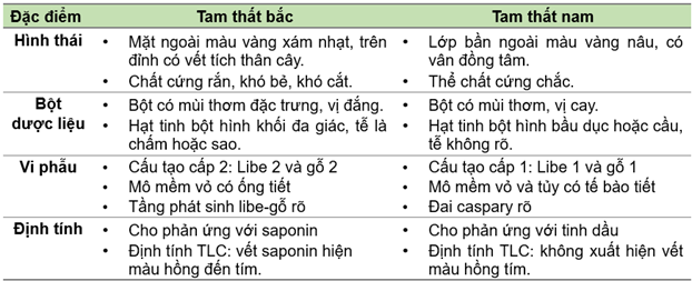 Dưới đây là bảng tóm tắt một số đặc điểm khác biệt nổi bật có thể phân biệt giữa Tam thất bắc và Tam thất nam.
