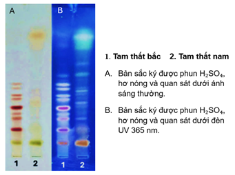 Sắc ký lớp mỏng là phương pháp phân tích thành phần hóa học, hiệu quả hơn so với soi kính hiển vi trong việc phân biệt bột Tam thất bắc và nam, đặc biệt là khi có nguy cơ bị trộn lẫn. Phương pháp này giúp phân tích thành phần hóa học, từ đó xác định chính xác loại dược liệu và độ tinh khiết của sản phẩm.